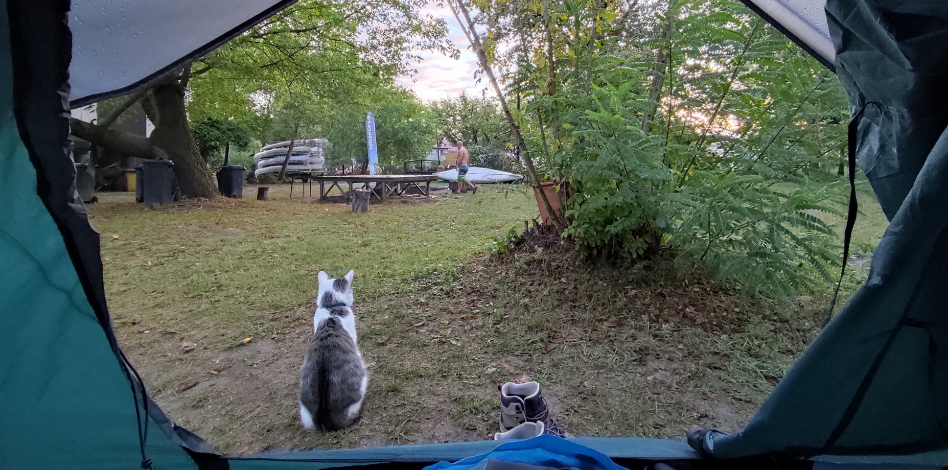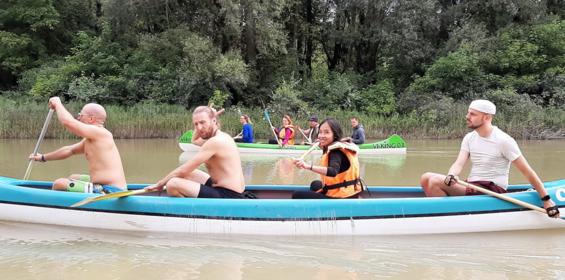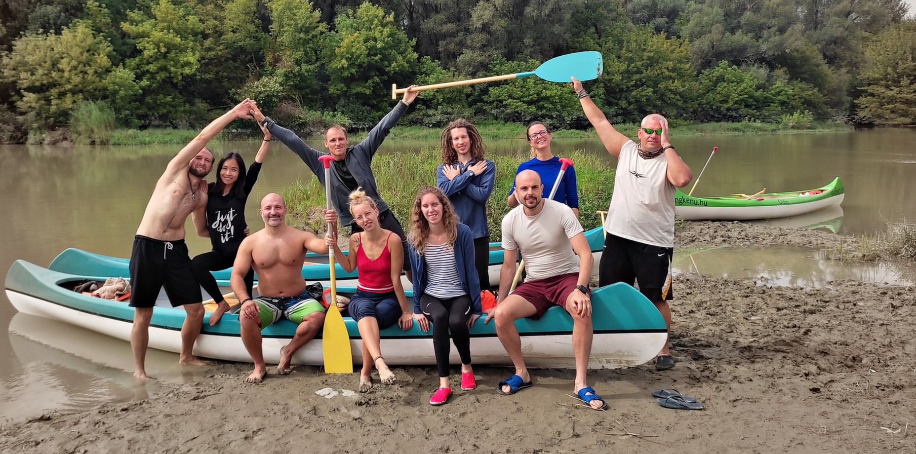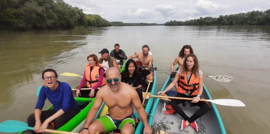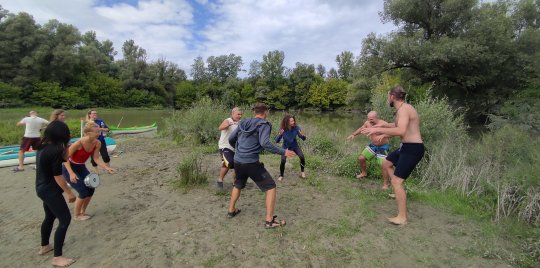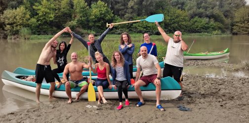 "Baja: A legkülönlegesebb evezésünk a Dunán. A kenukba magunkkal vittük a hangszereket majd a folyón lefelé csorogva zenéltünk és mantrákat énekeltünk. A szállásunk a Fekete Gólya pihenőházban volt, de többen sátraztak a területen. Este a faházba gyűltünk össze, ahova mind befértünk és örömzenéltünk, énekeltünk. Másnap az esti esőzés után csodás volt evezni a nyugodt környezetben, egy kis szigeten kikötöttünk és Eszti vezetésével dobszóra törzsi táncot jártunk, utána pedig a férfiakkal Hakáztunk. Sajnos a jógát és a tábortüzes táncot az esőzések miatt nem tudtam megtartani, de jövőre visszatérünk! Ezt a rövid youtube mantrás videót Eszti készítette, csoda mindig visszanézni milyen különleges volt a kenukban zenélni: roMANTRA éneklés a vizen