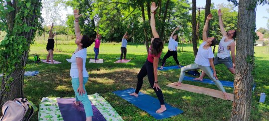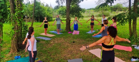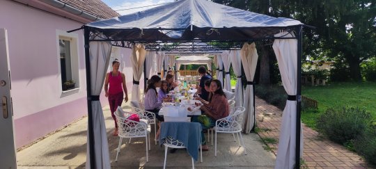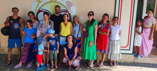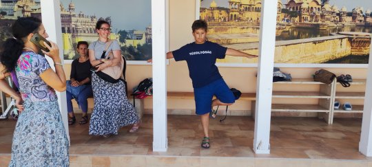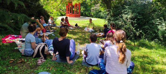 Krisna-völgyben családi jógatábort szerveztünk Váczi Erika jógaoktató kolléganőmmel: Krisna-völgy bejáratától 200 méterre a Kamala vendégházban, 6 ágyas szobákban szálltunk meg. A gyerekjóga és hatha-jóga órákat kint a szabadban, a vendégházat körülvevő füves, fás területen tartottuk. - PÉNTEKEN érkeztünk meg a szállásra egy szuper balatoni csobbanás után. Egy rövid eligazító kör után pedig Erika gyerekjógát tartott a fiataloknak a réten, én pedig a felnőtteknek tartottam hatha-jógát egy csodaszép fás oázisban. A vacsora után szép lassan nyugovóra tértünk, mert reggel 04:30-ra már fakultatív arati szertartásra lehetett menni...SZOMBATON az Arati szertartás után könnyed napindító jógát tartottunk a felnőtteknek és a gyerekeknek a szabadban, aztán a reggeli elfogyasztása után sétáltunk be a békés völgybe, ahol Mohana Prabu a védikus filozófiàról tartott előadást, pompázó növények között ültünk le kint az árnyékban. Az ebédet a templom területén a Govinda étteremben fogyasztottuk el, majd szabadfogalkozás után újra jógát tartottunk a családnak az esti kírtán előtt. Felemelő élmény volt a csodás templomban a szertartás közben együtt énekelni, zenélni... VASÁRNAP a fakultatív Arati szertartás után megreggeliztünk majd kicsekklotunk a szállásról. Még egy utolsó könnyed napindító jógát tartottunk a felnőtteknek és a gyerekeknek a szabadban, végül a hátralévő időben a békés völgyben sétálgattunk közösen. Az ebéd után pedig Fonyódon csobbantunk a Balatonban. Köszönjük szépen, hogy ennyien velünk tartottatok és békés pillanatoknak lehettetek a részesei. További örömteli napokat kívánunk.