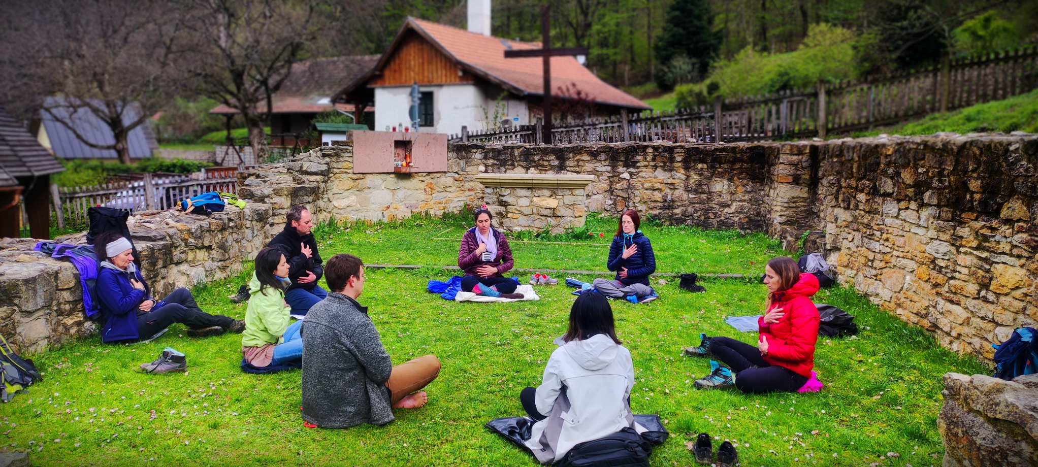" Egy belső lelki úton voltunk, távolságot vettünk a szürke hétköznapoktól. Pilisszentkereszt elágazástól sétáltunk a Pálos Remeték útja nyomának egyik szakaszán 15 kilómétert. Felhős időben felsétáltunk a csodálatos kilátásokkal teli ösvényen a Pálos Rend alapítójáról elnevezett Boldog Özséb Kilátóhoz. Mivel sok új túrázó volt velünk, akik nem ismerték egymást, rövid játékos bemutatkozó körrel kezdtünk az egyik réten, majd a kilátónál megebédeltünk. Simon halálától fegyelmezett teljes csendben 3 KM sétameditációt végeztünk a csodálatosan szép szurdokban egészen a Klastrompuszta Pálos romig, ahol ménrót övi ponton 20 perc ZEN meditáció után rövid energiagyakorlatot végeztünk és Brahmari jógalégzést M hangot zengettünk közösen. Végül beérkeztünk a varázslatos Pilisszentlélekre és felmentünk a kolostorromhoz, de már nem sok időnk maradt itt, hamarosan vissza kellett indulnunk a faluba. Nagyon kellemes sétánk volt, de nem maradtak otthon a meleg ruhák sem, végig felhős és hűvös időnk volt. Az időjárás szórványos esőt jósolt erre a napra, ami be is jött, a kilátónál be kellett húzódnunk menedékre kb.10percig. Az egész napunk nagyon szuper volt, hálás vagyok a fegyelmezett és a kedves, elmélyült csapatnak. További békés utat kívánok a belső utunkon." Bárki végigjárhatja a pálos utakat egyedül is: www.palosut.hu